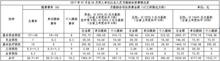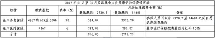 2017年01月至06月社會(huì)保險(xiǎn)繳費(fèi)基數(shù)和費(fèi)率