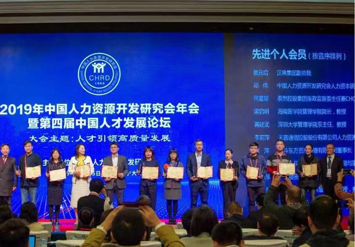 于2019年10月25日,??谔锔H肆Y源有限公司及海南漢斯邁企業管理咨詢有限公司董事長兼總經理陳海平獲邀參加2019年中國人力資源開發研究會年會暨第四屆中國人才發展論壇。會上增補部分優秀人力資源從業者擔任理事和常務理事,同時表彰先進分支機構、先進會員單位和先進個人會員。陳海平先生榮獲先進個人會員表彰。